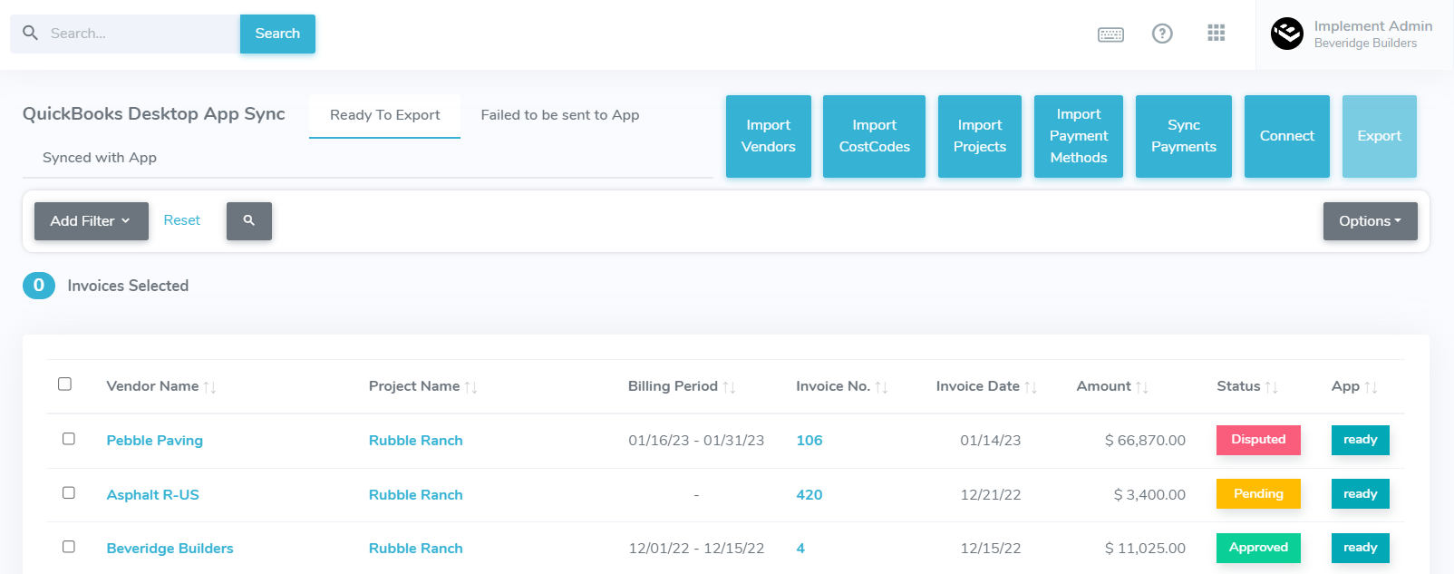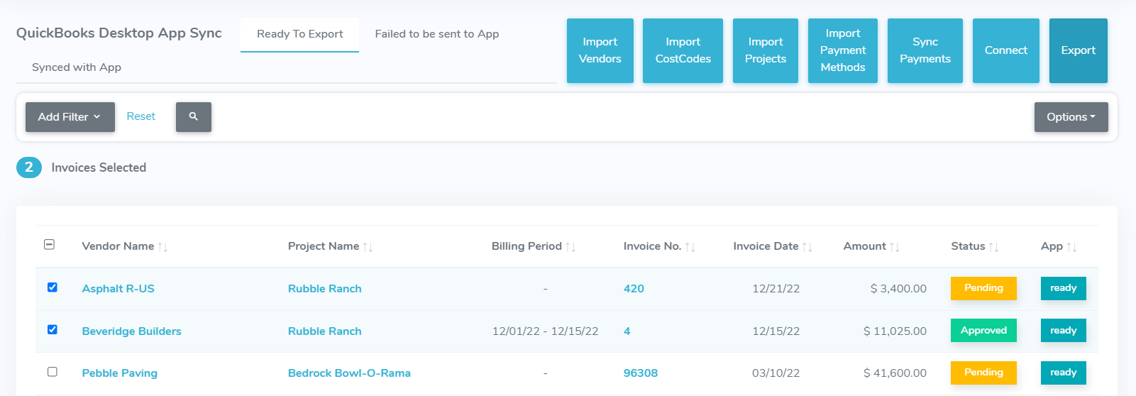 Here you will have three tabs to monitor your synced invoices. The options are: Ready to Export, Failed to be Sent to App, and Synced with App.