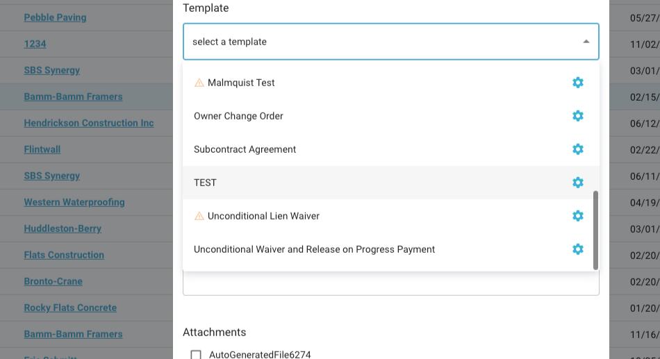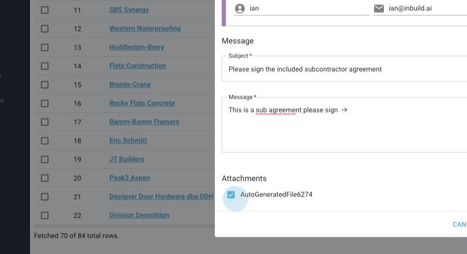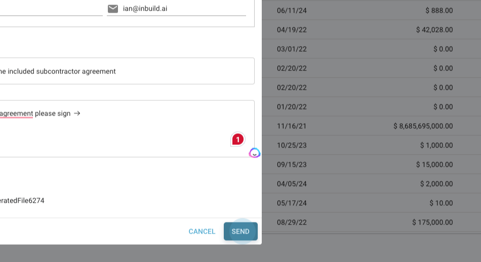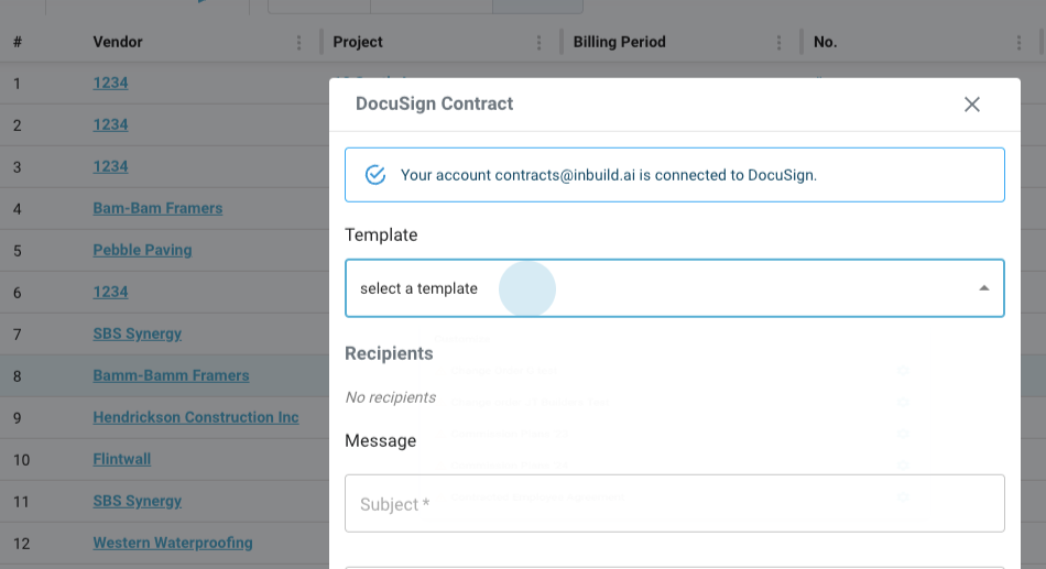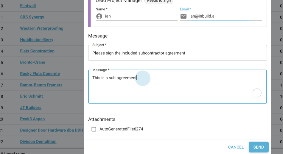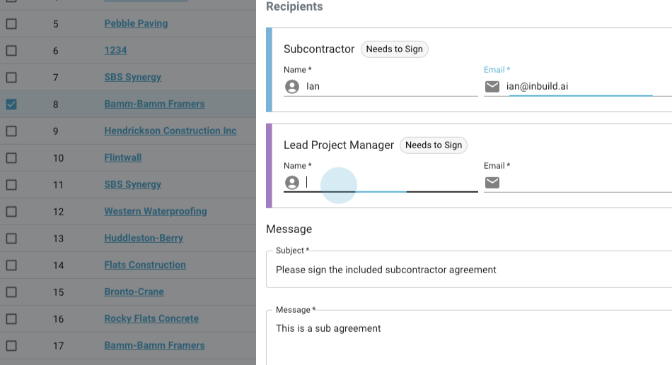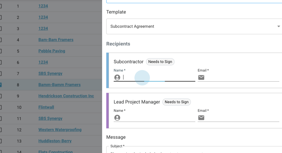 Step 3: Click Send, select the appropriate template (for example, Subcontract Agreement), and enter the recipient's information.