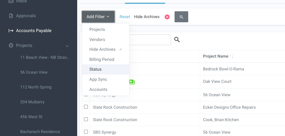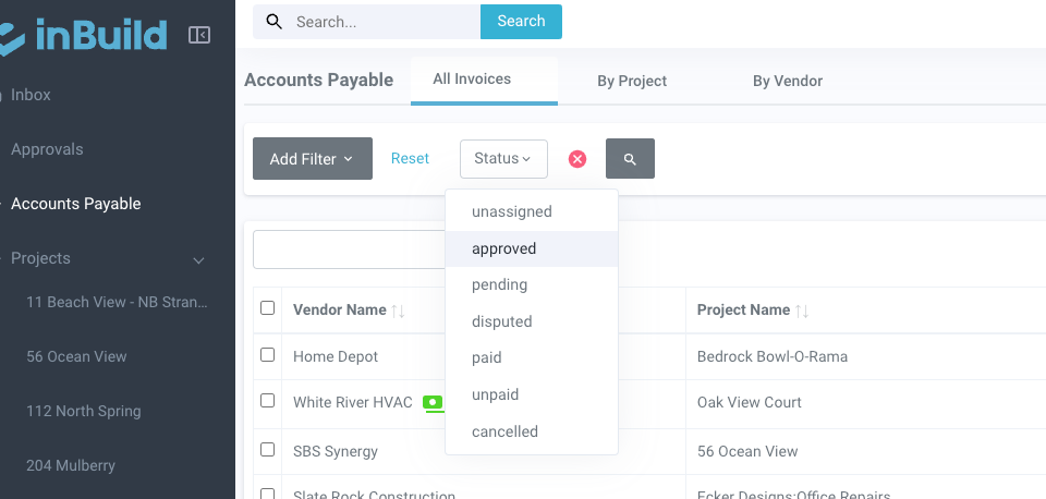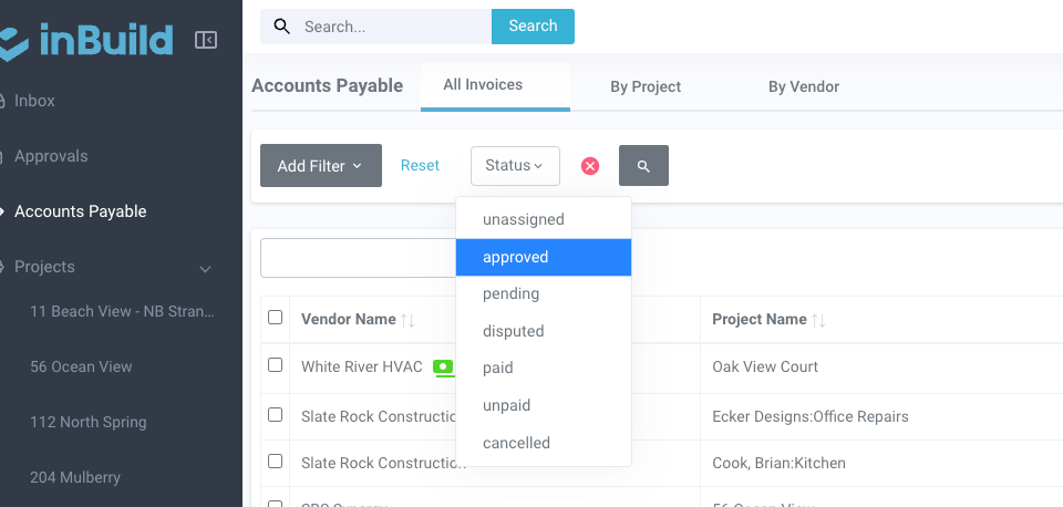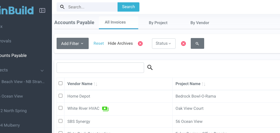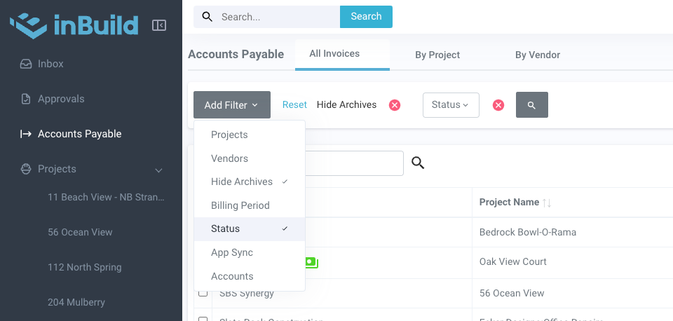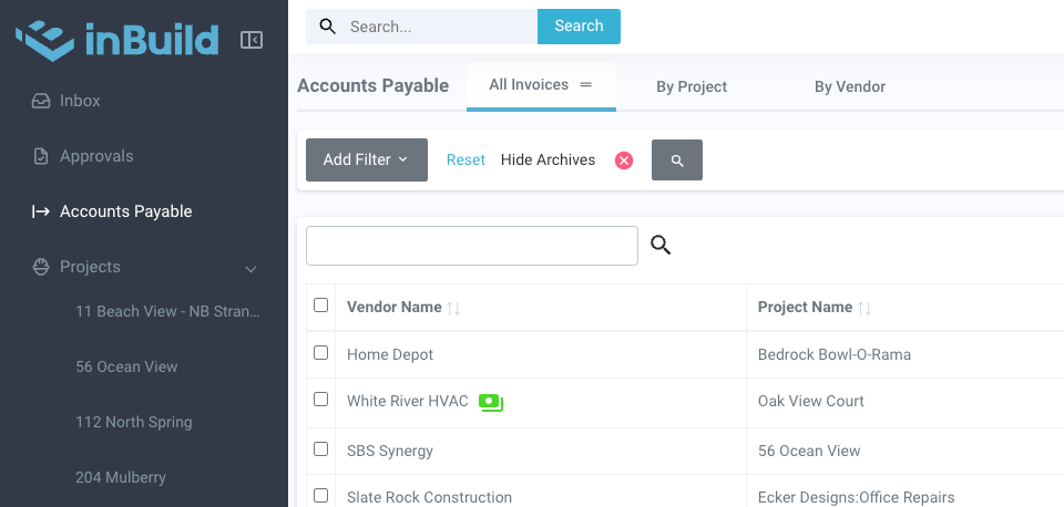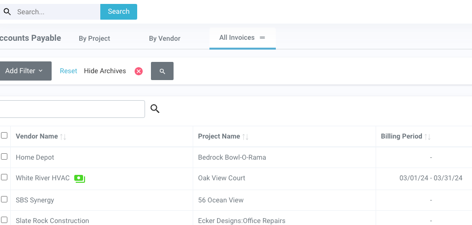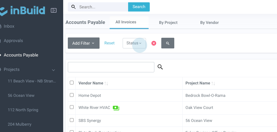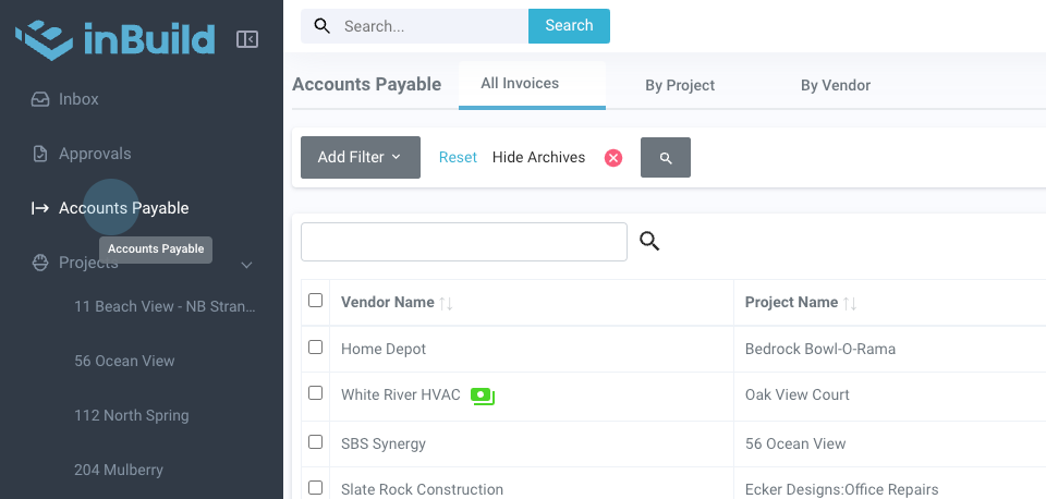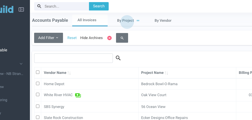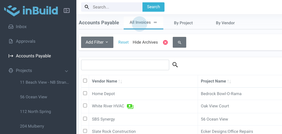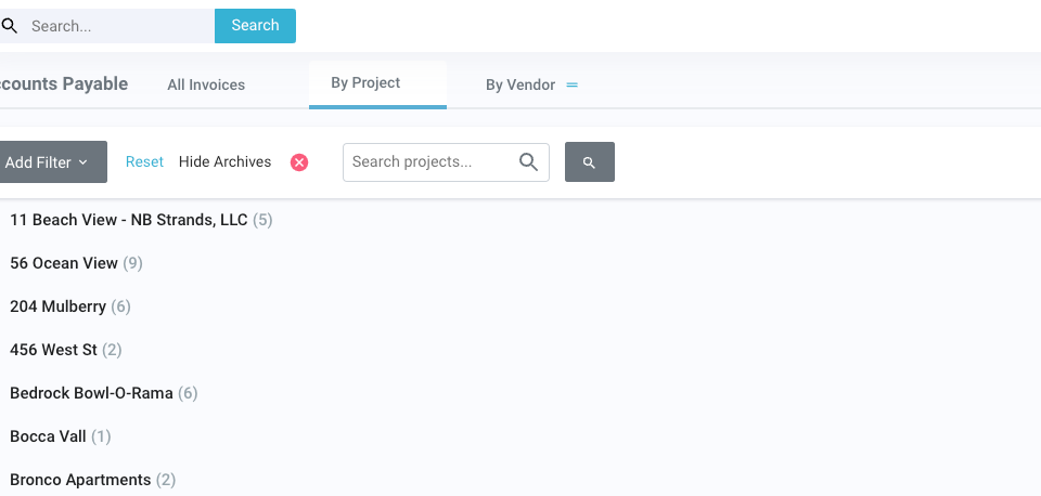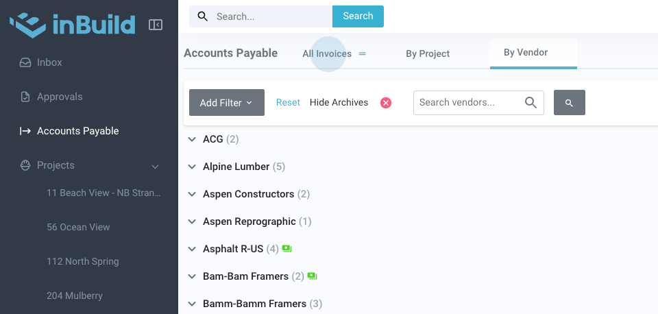 Step 1: Begin in the accounts payable tab. Search for invoices either by All Invoices, Project or Vendor.
