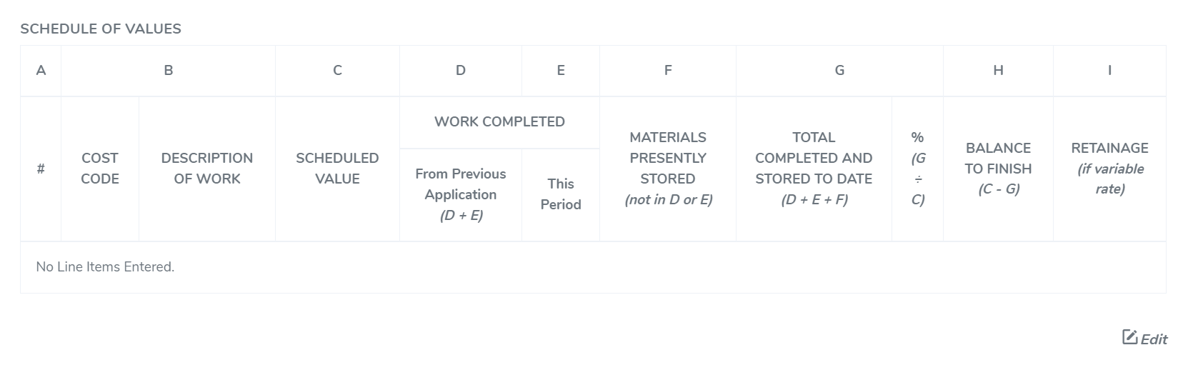 To 📝 Edit the contract Schedule of Values click the 📝 Edit button in the lower right-hand corner of the SOV table. Here you can add SOV Line Items in the same fashion as coding an invoice.