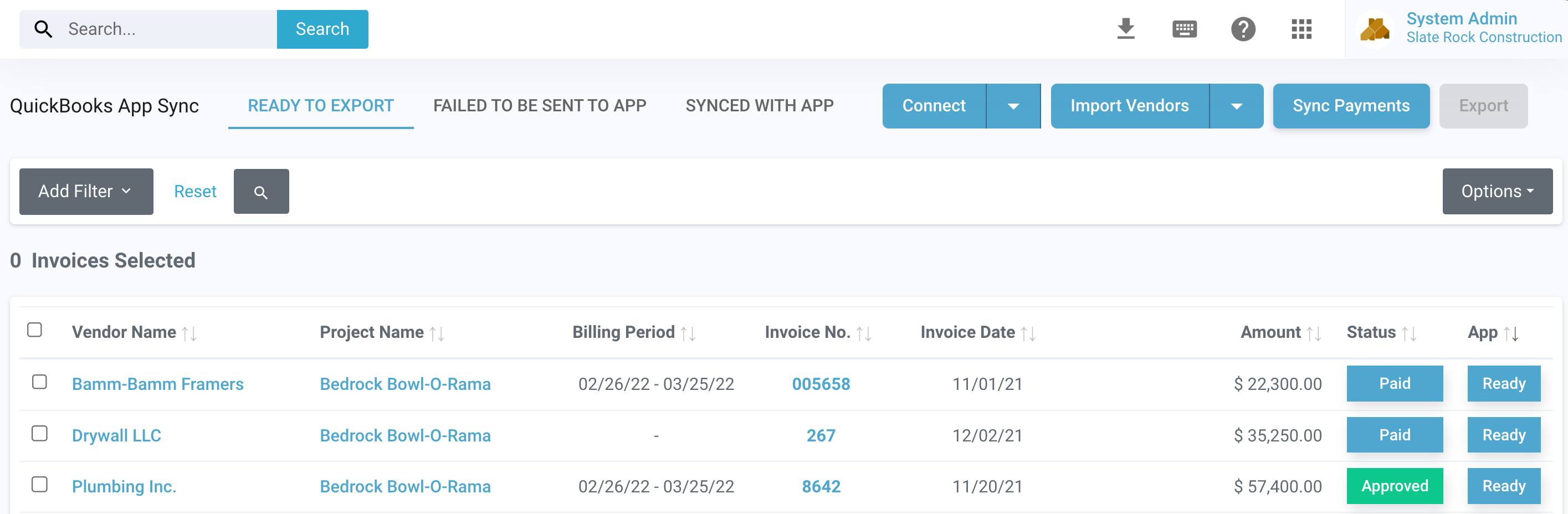 Here you will have three tabs to monitor your synced invoices. The options are: Ready to Export, Failed to be Sent to App, and Synced with App.
