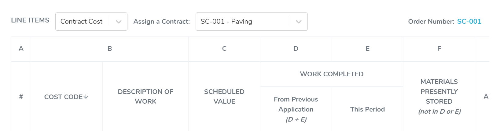 If selecting Contract Cost a new dropdown will appear requiring you to Assign a Contract. This contract list will depend on the selected Project and Vendor assigned to the invoice. If no contract exists for these conditions, you will be prompted to create a new one. Once you have selected a contract to assign costs to, the Schedule of Values will load. This will include the original contract SOV, as well as any Change Orders appended to the original contract.