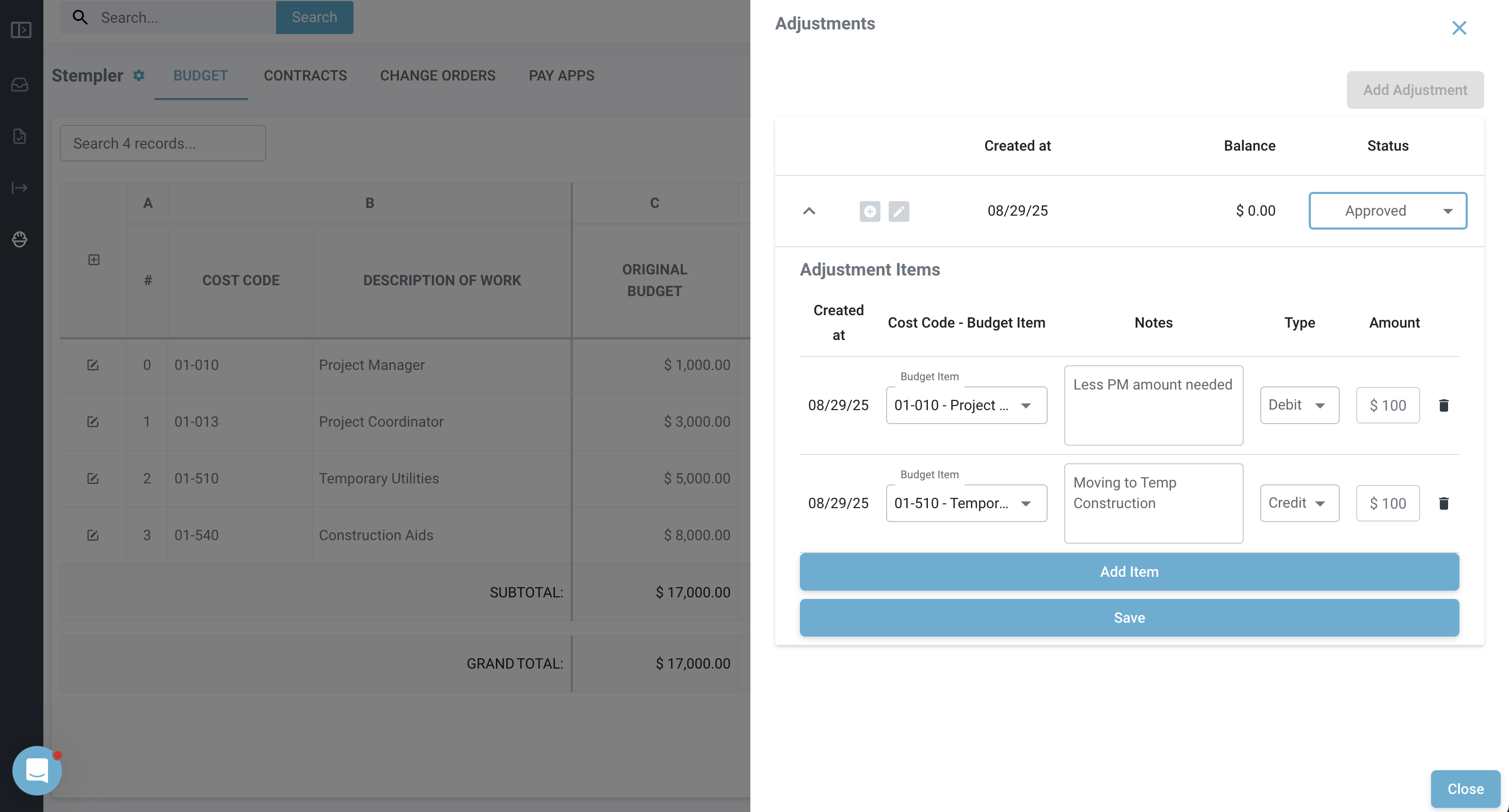 The Budget Adjustment feature lets you modify project budgets in a controlled and trackable way. Whether you need to credit funds to an item or debit them, adjustments keep your budget accurate while maintaining a clear audit trail.